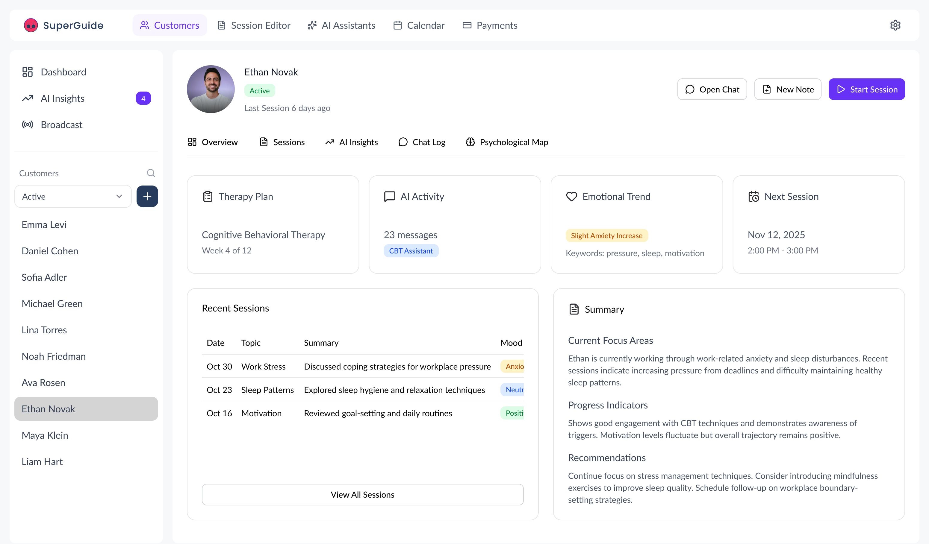 Access every patient’s journey in one view. Sessions, notes, insights, and goals come together into a single, intelligent hub. Understand progress, spot patterns, and walk into every meeting fully prepared.